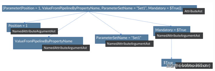 这是一种AttributeAst,对应脚本中的一行语句,通过各种属性值来表示ParamBlockAst中的某个参数。这个Ast中包含4个子节点,这些节点为该参数目前具备的所有属性。其中有个属性为”Mandatory“属性,这表明调用该函数时必须使用该参数。Mandatory属性为布尔(boolean)类型,值为True或者False。在PowerShell中,我们可以直接使用名称(如“Mandatory“)来指定True值布尔属性,或者可以通过赋值True达到相同目的(比如“Mandatory = $True”)。目前,我们使用的是名称表示法,现在我们可以稍作改变: