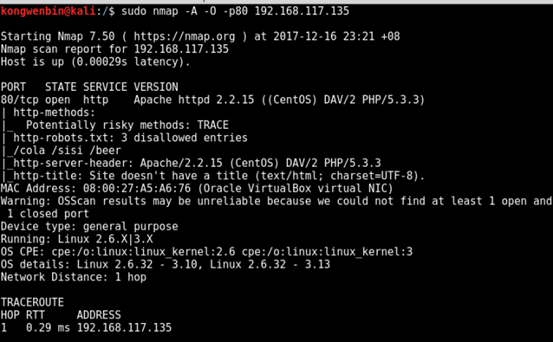 我们看到以下具体信息: Apache httpd 2.2.15 ((CentOS) DAV/2 PHP/5.3.3) http-robots.txt: 3 disallowed entries