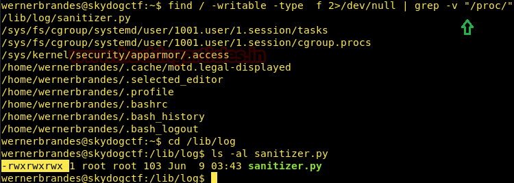 首先,我们来启动我们的攻击机并渗透进目标系统直至提权阶段。这里假设我通过ssh成功登录到了受害者机器,并访问了非root用户的终端。通过以下命令,我们可以枚举所有具有可写权限的二进制文件。