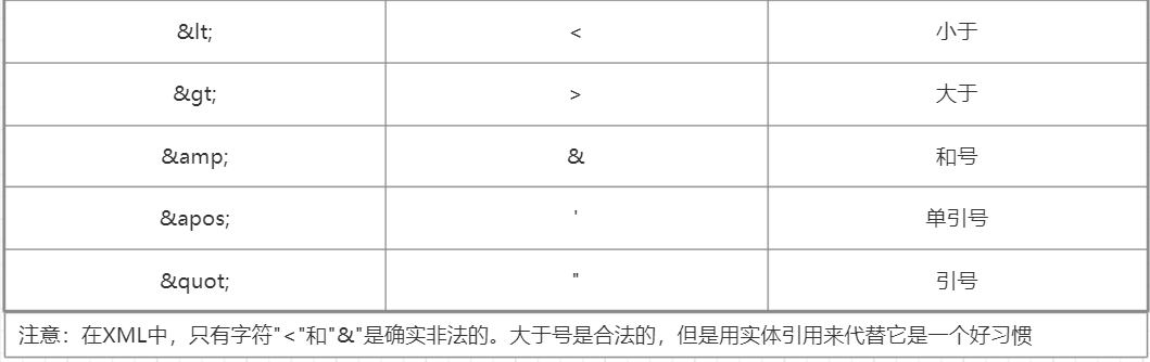 `<message>hello < world</message>`,为了避免错误。我们用实体引用`<`来代替”<”字符。XML中,有5个预定义的实体引用。