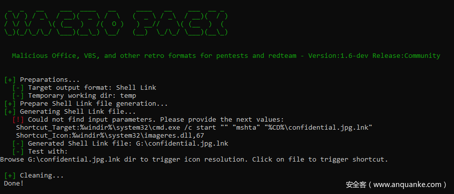 来生成LNK。我选择直接将快捷方式生成到USB介质中,避免我们拷贝快捷方式时系统对其做出修改。这里USB介质的卷标为“G:”。