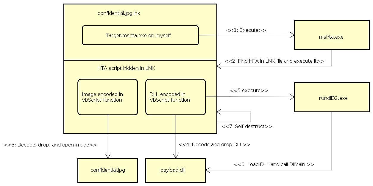 )。快捷方式中隐藏着一个HTA释放器(dropper)。LNK会执行HTA文件,后者会释放并执行DLL载荷,并将快捷方式替换为一张欺诈图片(confidential.jpg
