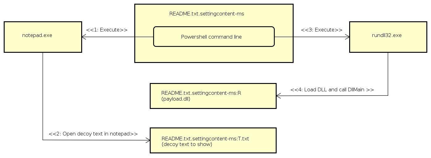 这个settingcontent-ms文件将会执行隐藏在Alternate Data Stream(README.txt.settingcontent-ms:R)中的DLL,也会运行Notepad来显示另一个ADS(README.txt.settingcontent-ms:T.txt)中存放的欺诈文本。