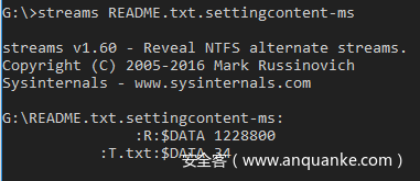 我们可以使用sysinternal的“Streams”工具来检查创建的ADS的确对应USB介质上的文件。