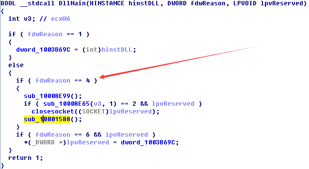 查看DllMain可知只有当fdwReason参数为4才执行远控功能流程,这也导致正常情况下加载该DLL将不会触发该远控流程。
