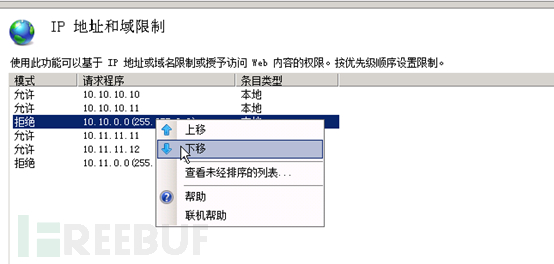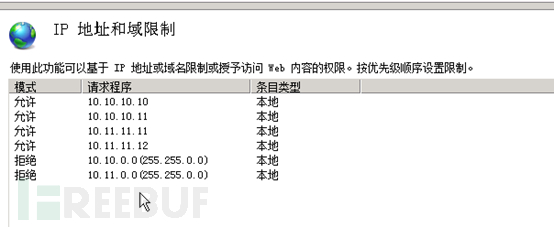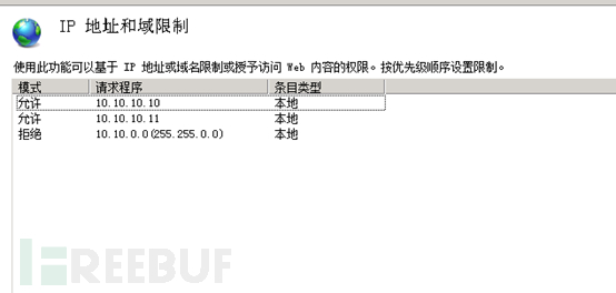 这时候我们看到在网站的访问控制当中,先运行这两个访问,后禁止10.10.0.0/16访问,达到的效果是除了这两个IP外,10.10.0.0/16的其他IP均无法访问网站