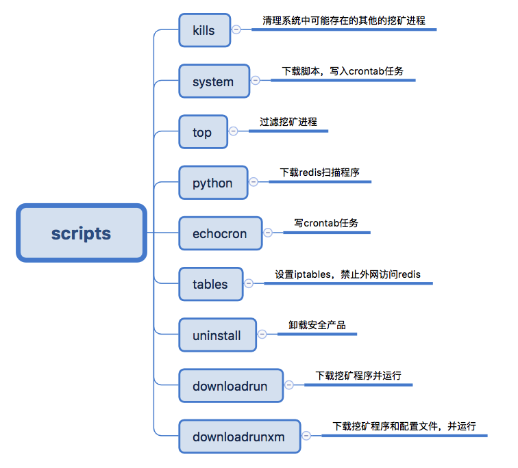 攻击者利用 Redis 未授权访问漏洞入侵服务器,写入 crontab 任务下载恶意脚本并植入挖矿程序。仔细分析此次入侵事件,有以下特点: