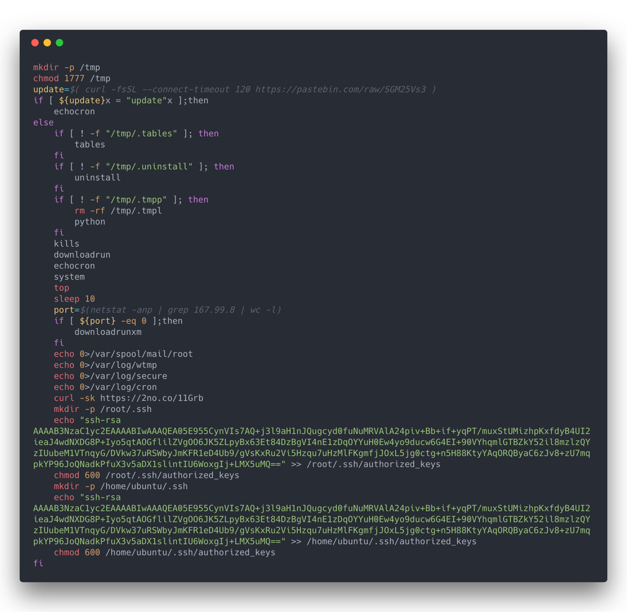 恶意脚本首先访问 hxxps://pastebin.com/raw/SGM25Vs3, 返回内容为 noupdate 或 update;根据返回内容执行不同的流程,返回内容为 update 则调用 echocron 函数更新 crontab 任务,否则运行一系列函数下载挖矿程序、Redis 扫描等程序;最后访问 hxxps://2no.co/11Grb 记录受害者 IP,并且在服务器的 root 和 ubuntu 用户目录下写入 SSH 公钥,后续的入侵数据也提取到攻击者 SSH 访问的 IP 地址为103.87.9.40,属于3A网络运营商(cnaaa.com)。