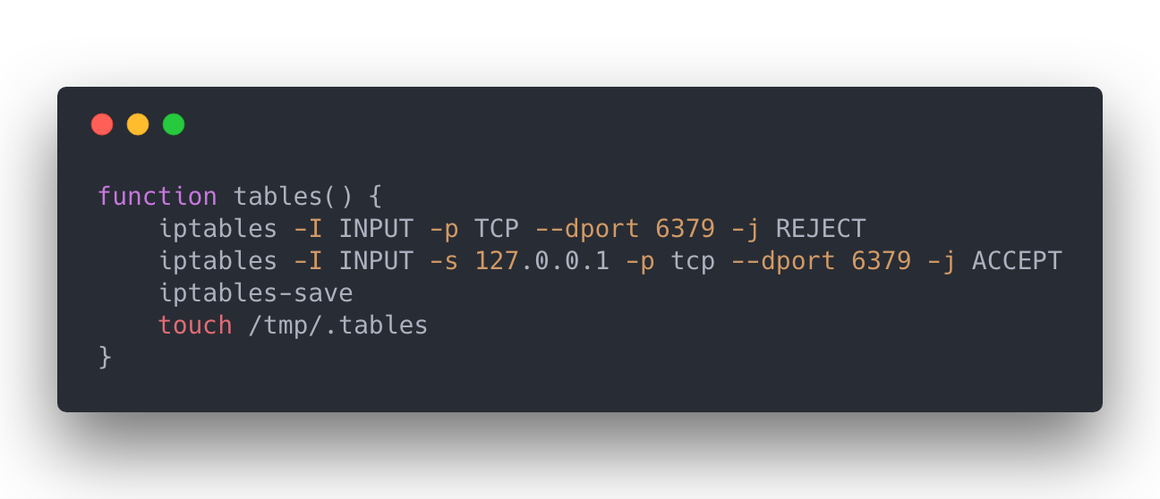 tables 函数设置 iptables 规则,禁止外网访问 Redis 6379端口,运行本地访问6379端口。生成 /tmp/.tables 文件,作为 iptables 规则设置的标志。