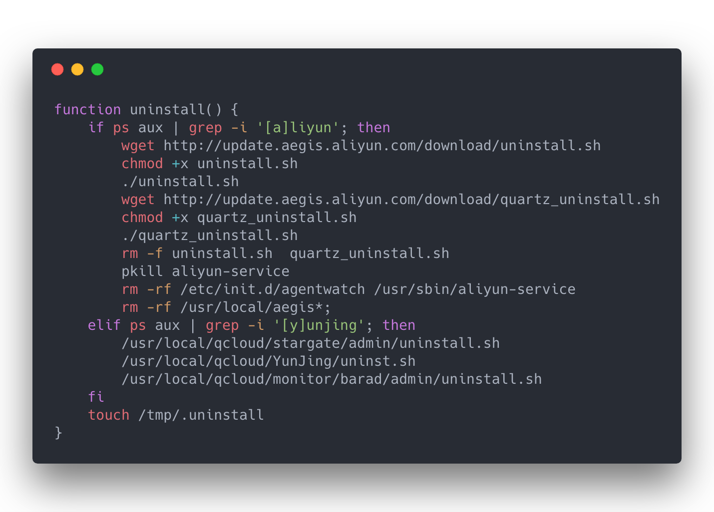 uninstall 函数卸载安全产品,生成 /tmp/.uninstall 文件作为卸载成功的标志。