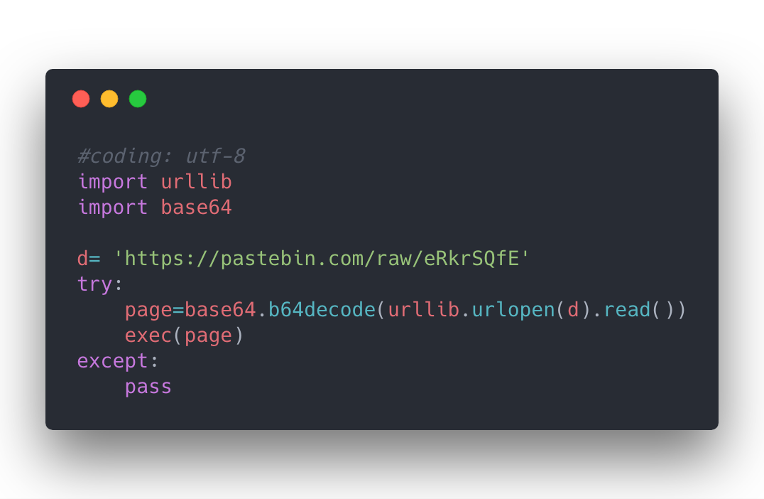 从 hxxps://pastebin.com/raw/eRkrSQfE 获取 base64 编码的内容,解码后执行。解码内容如下: