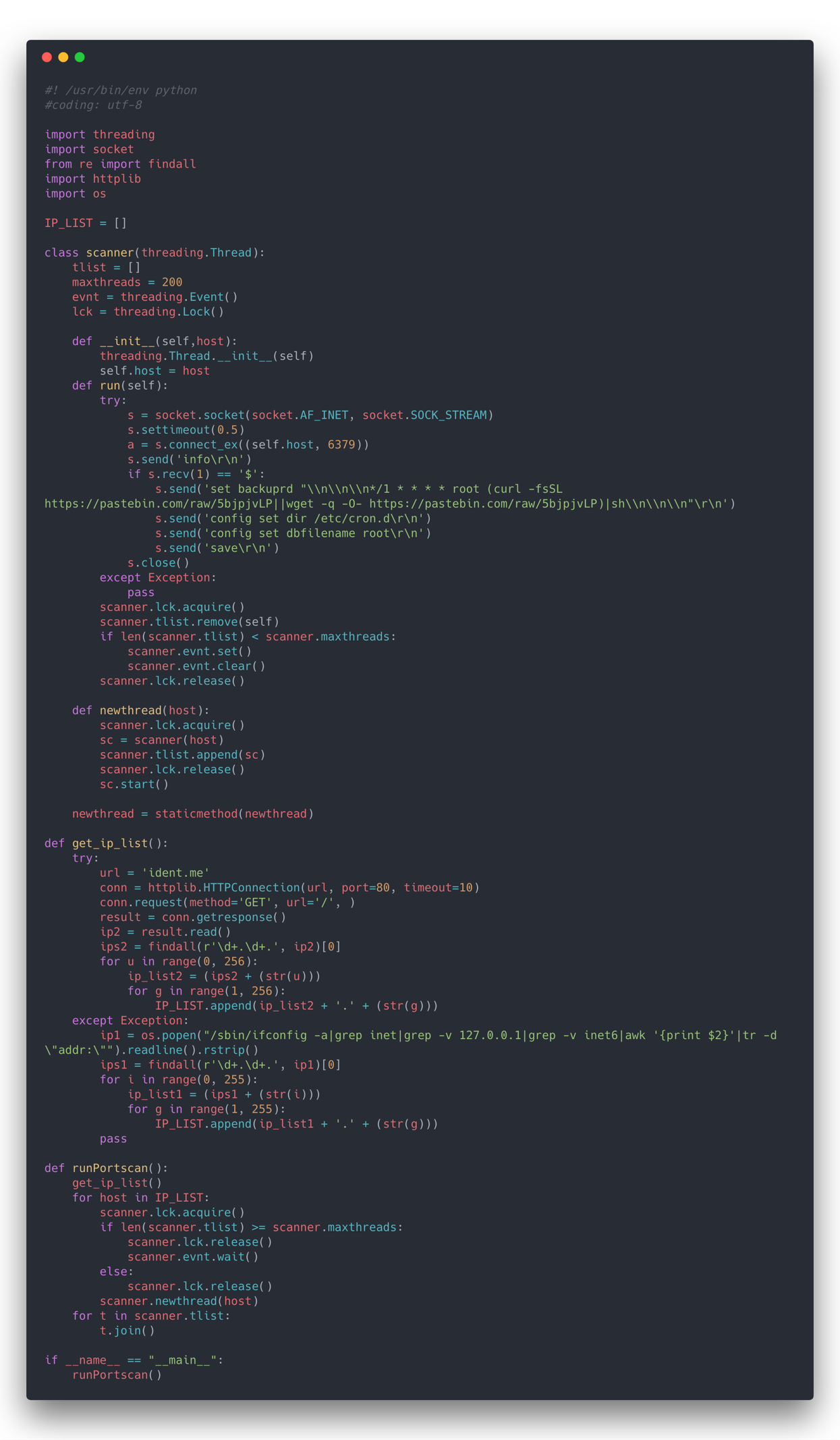 Python 脚本扫描外网开放6379端口的服务器,利用 Redis 未授权访问漏洞写 crontab 任务。脚本从 ident.me 站点获取要扫描的 IP 地址,生成B段 IP 地址列表,然后扫描这些 IP 地址,若存在 Redis 未授权漏洞,则写入 crontab 任务,内容如下: