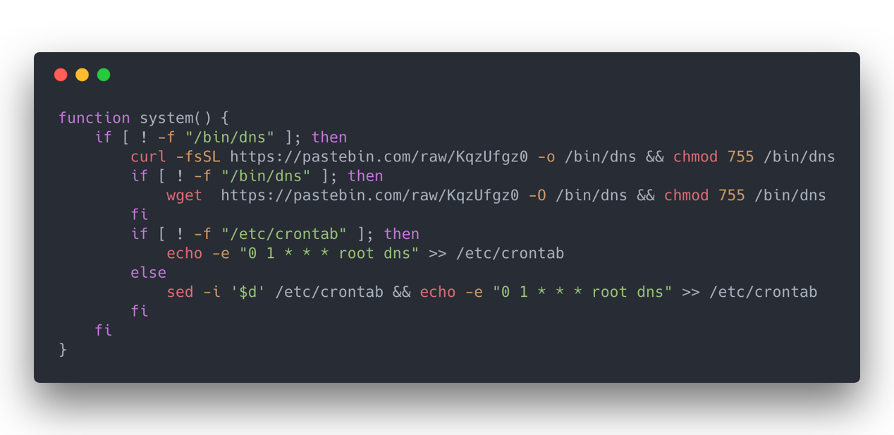 system 函数从 hxxps://pastebin.com/raw/KqzUfgz0 下载脚本命名为 dns,存放于系统 bin 目录下,然后赋予脚本可执行权限,并写入crontab任务。dns 文件内容为