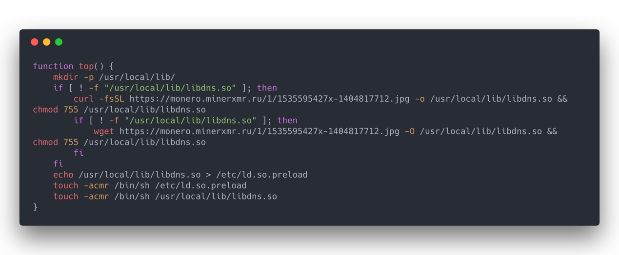 top 函数从 hxxps://monero.minerxmr.ru/1/1535595427x-1404817712.jpg 下载恶意程序,主要功能是过滤挖矿进程,过滤进程名为 kworkerds。下载文件命名为 libdns.so,存放在系统 /usr/local/lib/ 路径下,然后将 /usr/local/lib/libdns.so 写入 /etc/ld.so.preload,这里是利用 Linux 的动态链接库预加载机制,是一种常用的进程隐藏方法,而系统命令 top 受这个机制影响的。因此在 Linux 上执行 top 命令并不能看到挖矿的进程。
