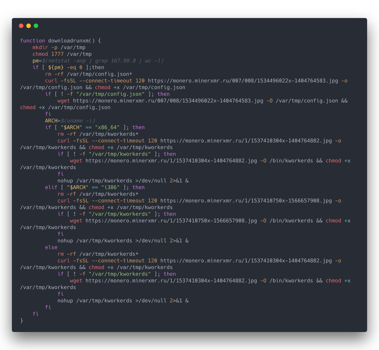 ➢ 留存在系统上的恶意脚本功能不全,仅仅守护挖矿进程,隐藏真实的攻击手法;