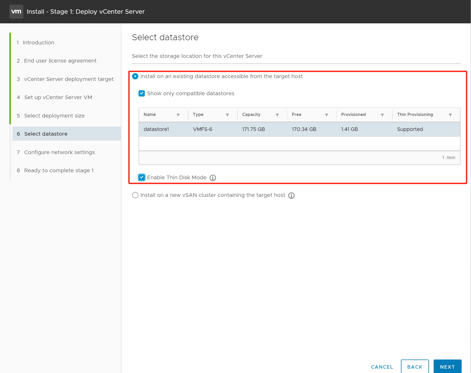 7.选择ESXI主机存储的存放位置,以及选择精简模式