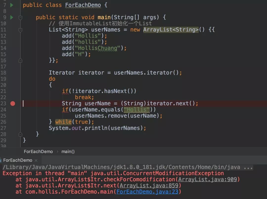 通过异常堆栈我们可以到,异常发生的调用链ForEachDemo的第23行,Iterator.next 调用了 Iterator.checkForComodification方法 ,而异常就是checkForComodification方法中抛出的。