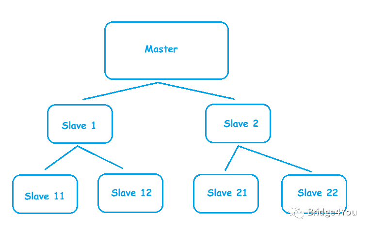 这样最顶层的Master的备份压力就没那么大了,它只需要备份两次,然后让那它底下的那两台Slave再去和他们的Slave备份。