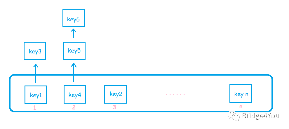好,现在key1放到index为2的位置,突然又来了一个key9,刚好他也要放到index为2的位置,那咋办,总不能把人家key1给踢掉吧?所以key1的信息必须存储在一个链表结构里面,这样key9来了之后,只需要把key1所在的链表节点的next,指向key9的链表节点即可。