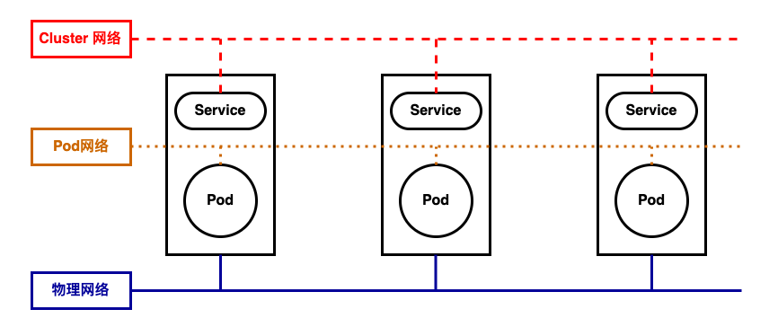 从上面的架构图中我们可以看到,在K8S中,每一台物理主机都有一个IP地址,每启动一个Pod都会有一个Pod地址,每创建一个服务,都会有一个Service地址。从此我们可以看出,K8S中共有3层网络,其分别是物理网络、Pod网络、Service网络,其中Service网络又称之为Cluster网络,其网络架构如下图所示: