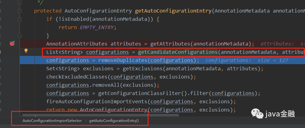 getAutoConfigurationEntry这个方法当执行完getCandidateConfigurations这个方法的时候我们可以看到此时总共加载了127个自动配置类。这些类难道都要加载进去吗?