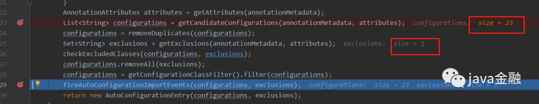 这些注解都组合了@Conditional注解,只是使用了不同的条件组合最后为true时才会去实例化需要实例化的类,否则忽略过滤掉。我们在回到代码可以看到经过了条件判断过滤后我们剩下符合条件的自动配置类只剩23个了。其他的都是因为不满足条件注解而被过滤了。如果我们想知道哪些自动配置类被过滤了,是由于什么原因被过滤了,以及加载了哪些类等。