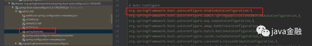 这个注解我们重点看下AutoConfigurationImportSelector这个类getCandidateConfigurations这个方法里面通过SpringFactoriesLoader.loadFactoryNames()扫描所有具有META-INF/spring.factories的jar包( spring.factories 我们可以理解成 Spring Boot 自己的 SPI 机制)。spring-boot-autoconfigure-x.x.x.x.jar里就有一个spring.factories文件。spring.factories文件由一组一组的Key = value的形式,其中一个key是EnableAutoConfiguration类的全类名,而它的value是一个以AutoConfiguration结尾的类名的列表,有redis、mq等这些类名以逗号分隔。