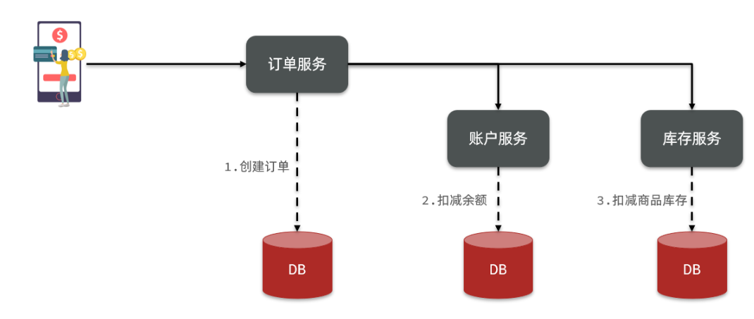 完成上面的操作需要访问三个不同的微服务和三个不同的数据库。