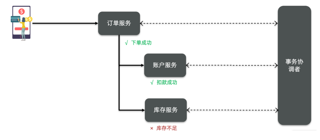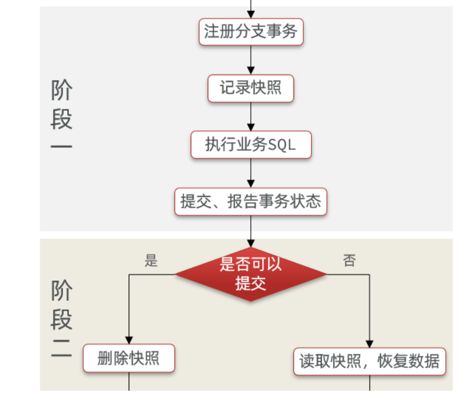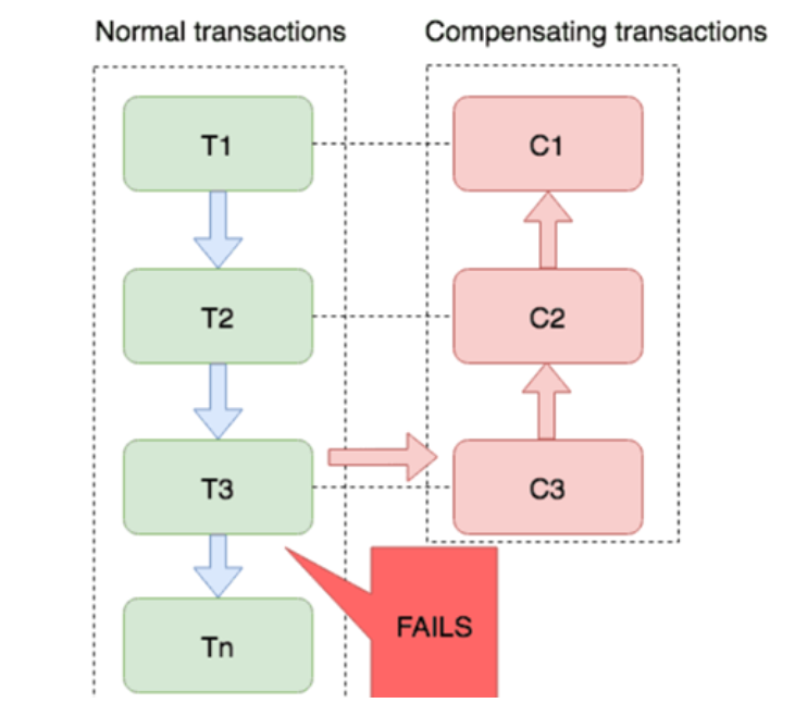 分布式事务执行过程中,依次执行各参与者的正向操作,如果所有正向操作均执行成功,那么分布式事务提交。如果任何一个正向操作执行失败,那么分布式事务会去退回去执行前面各参与者的逆向回滚操作,回滚已提交的参与者,使分布式事务回到初始状态。