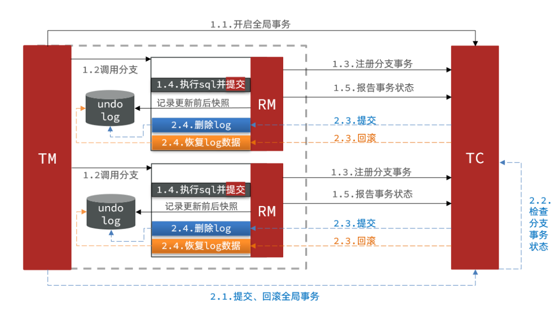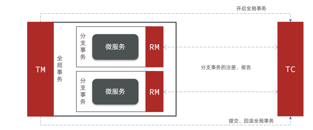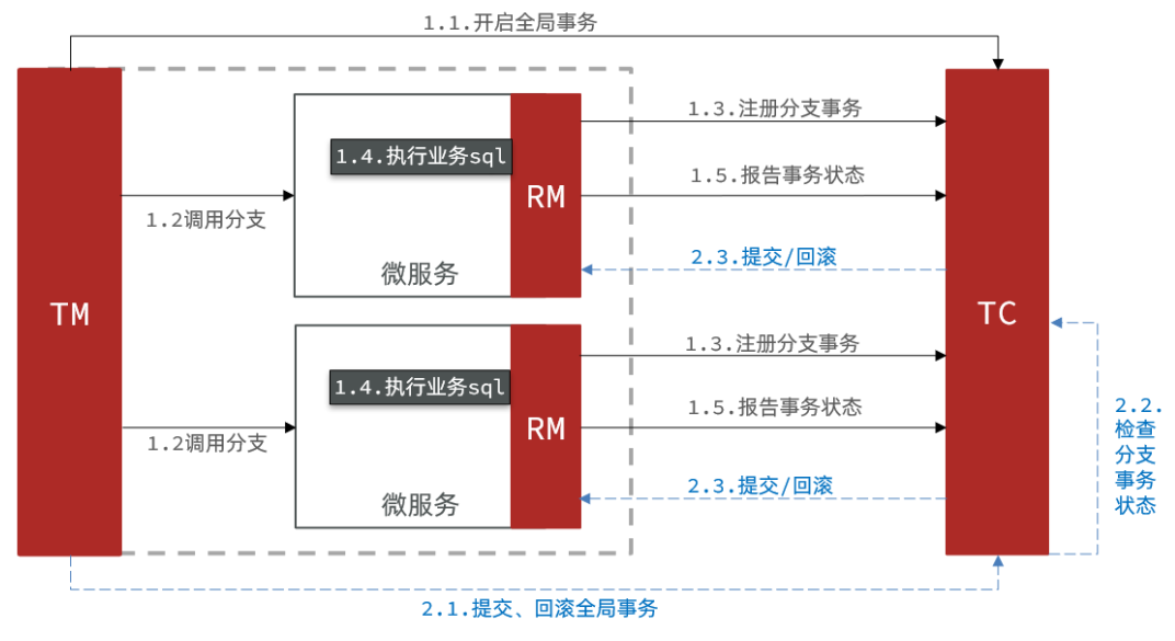 TC (Transaction Coordinator) - 事务协调者:维护全局和分支事务的状态,协调全局事务提交或回滚。