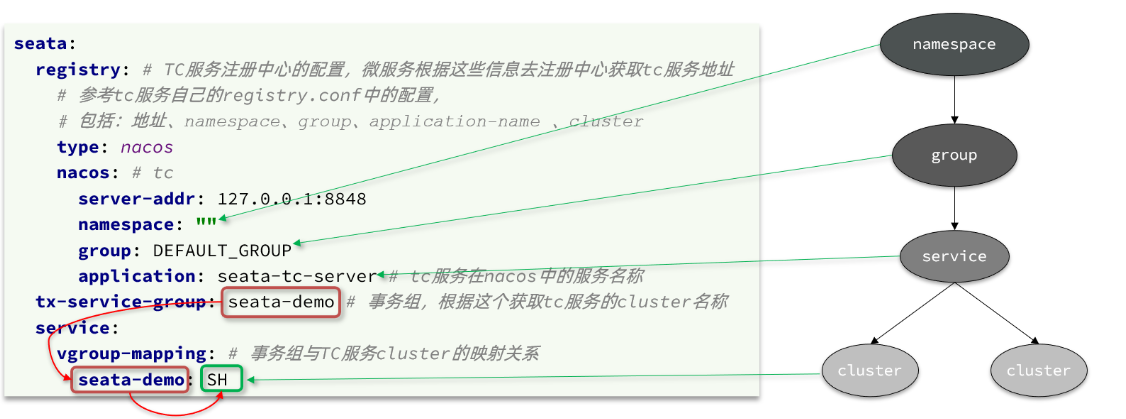 seata: registry: # TC服务注册中心的配置,微服务根据这些信息去注册中心获取tc服务地址 type: nacos # 注册中心类型 nacos nacos: server-addr: 127.0.0.1:8848 # nacos地址 namespace: "" # namespace,默认为空 group: DEFAULT_GROUP # 分组,默认是DEFAULT_GROUP application: seata-tc-server # seata服务名称 username: nacos password: nacos tx-service-group: seata-demo # 事务组名称 service: vgroup-mapping: # 事务组与cluster的映射关系 seata-demo: SH