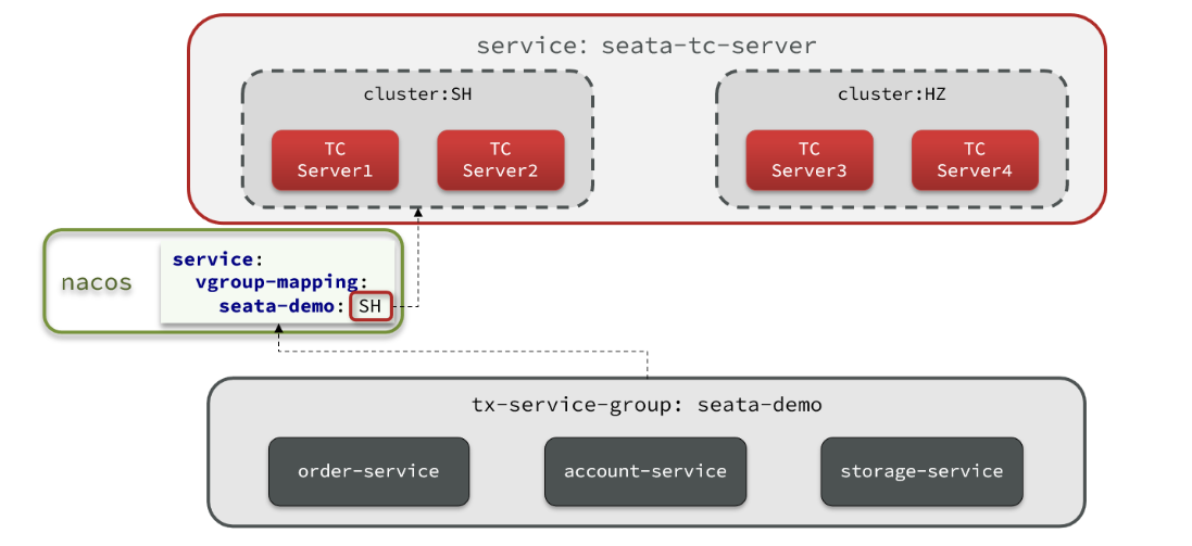 微服务基于事务组(tx-service-group)与TC集群的映射关系,来查找当前应该使用哪个TC集群。当SH集群故障时,只需要将vgroup-mapping中的映射关系改成HZ。则所有微服务就会切换到HZ的TC集群了。