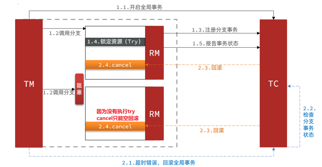 执行try操作时,应当判断cancel是否已经执行过了,如果已经执行,应当阻止空回滚后的try操作,避免悬挂