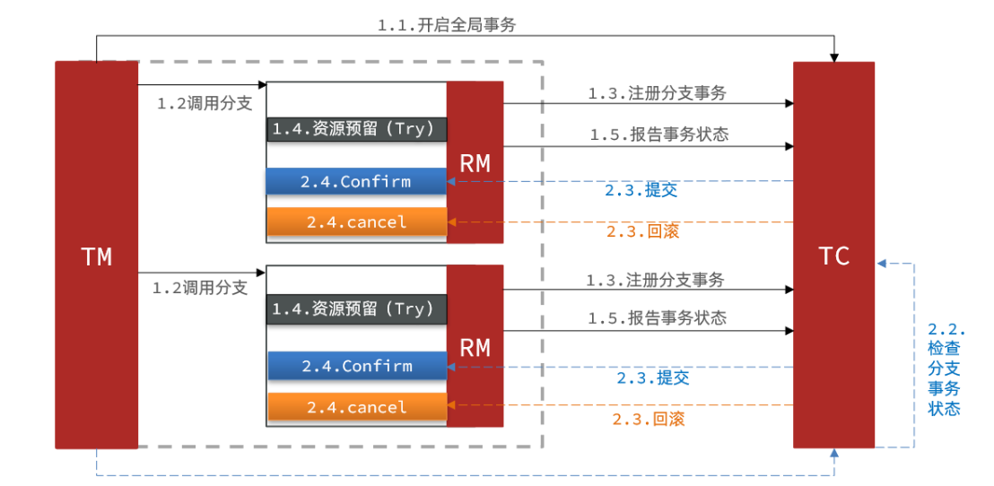 Seata中的TCC模型依然延续之前的事务架构,如图:
