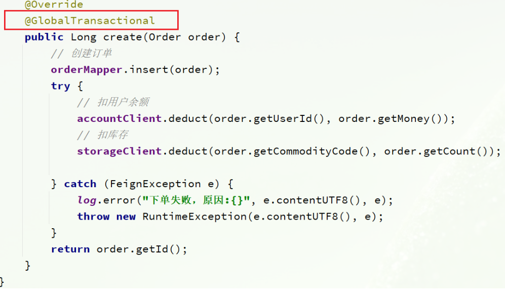 订单的创建、库存的扣减、账户扣款在每一个服务和数据库内是一个本地事务,可以保证ACID原则。