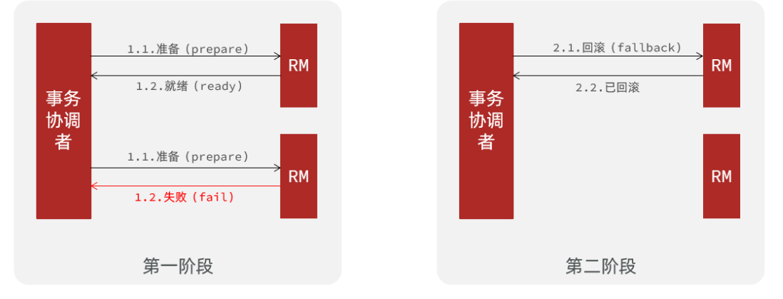 如果一阶段任意一个参与者失败,则通知所有事务参与者回滚事务