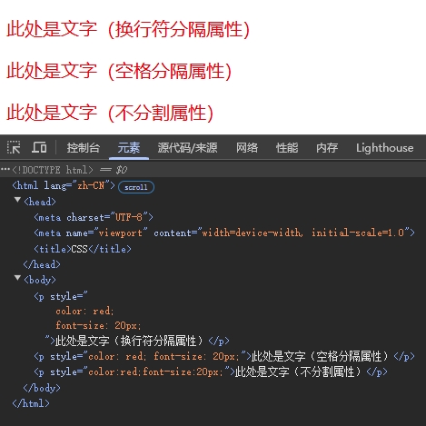 注意 CSS 属性分隔符,分别使用了换行符分隔属性、空格分隔属性、不分割属性,达到的效果是一致的。