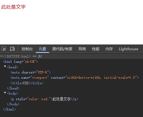 注意这段代码 <p style="color: red;">此处是文字</p> 其中的 color: red; 就是 CSS 语法,意思是给 p 标签添加一个 color 颜色属性,值为红色 red。