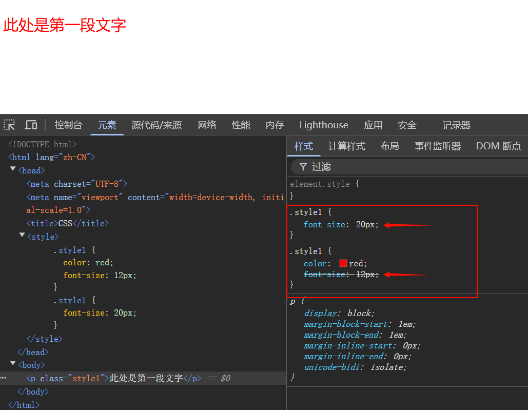 <p style="color: red; font-size: 20px; line-height: 32px; background-color: #333;">此处是第一段文字</p>
