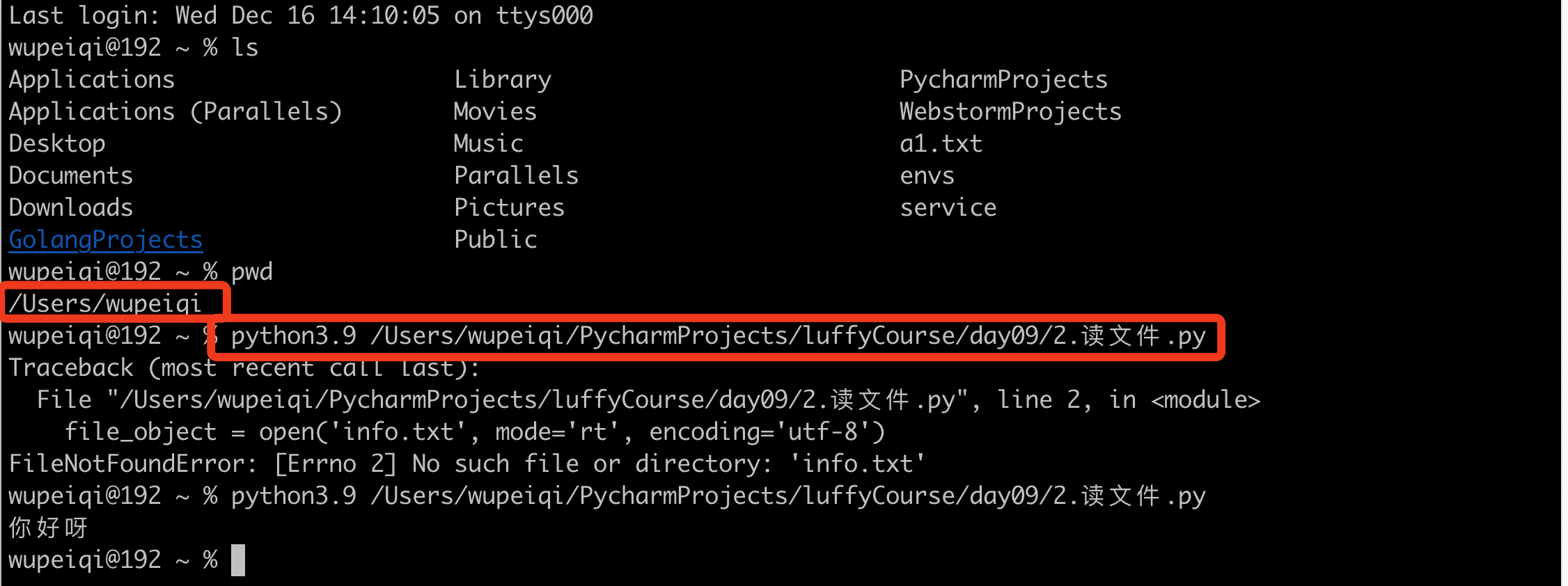 Traceback (most recent call last): File "/Users/wupeiqi/PycharmProjects/luffyCourse/day09/2.读文件.py", line 2, in <module> file_object = open('infower.txt', mode='rt', encoding='utf-8') FileNotFoundError: [Errno 2] No such file or directory: 'infower.txt'