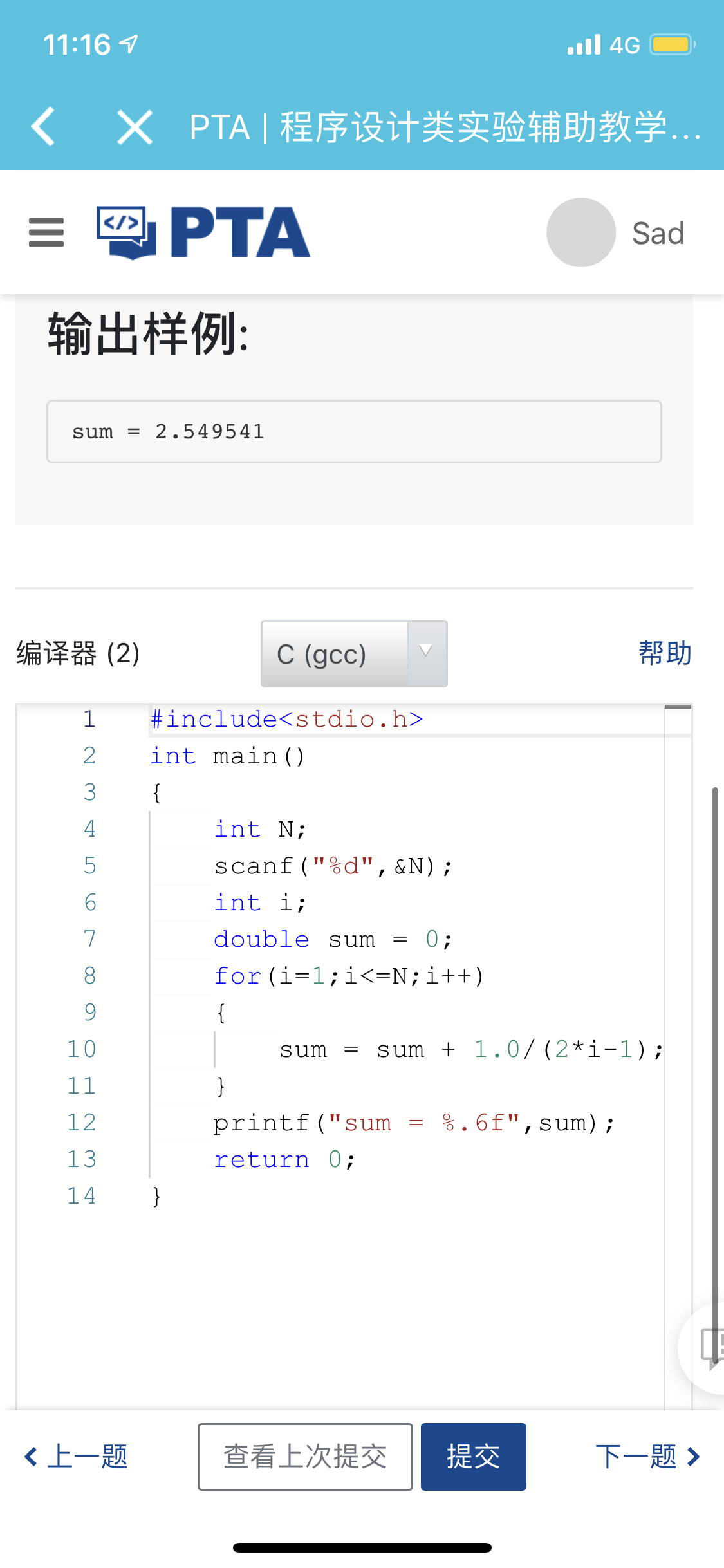 内容描述:本题要求编写程序,计算序列 1 + 1/2 + 1/3 + ... 的前N项之和。