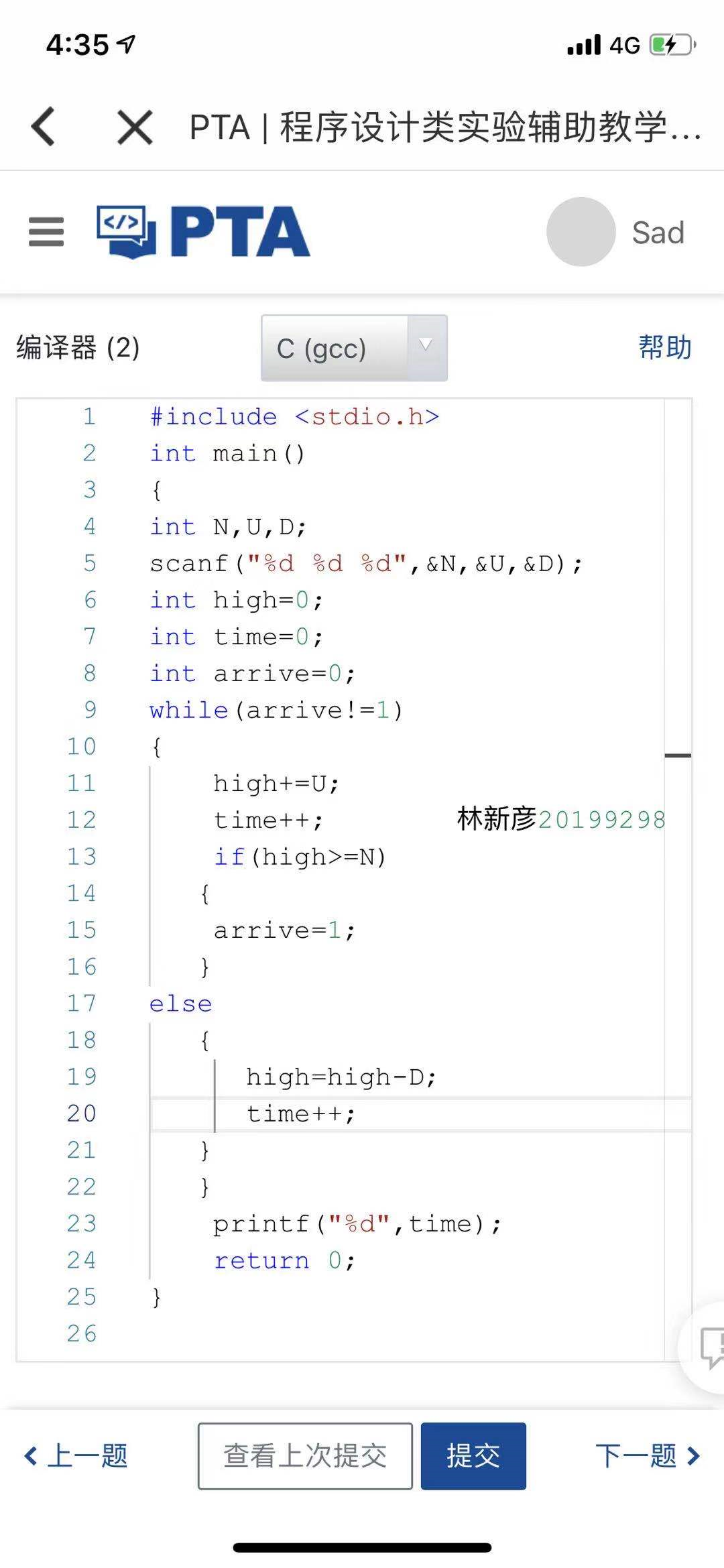 内容描述:条蠕虫长1寸,在一口深为N寸的井的底部。已知蠕虫每1分钟可以向上爬U寸,但必须休息1分钟才能接着往上爬。在休息的过程中,蠕虫又下滑了D寸。就这样,上爬和下滑重复进行。请问,蠕虫需要多长时间才能爬出井?