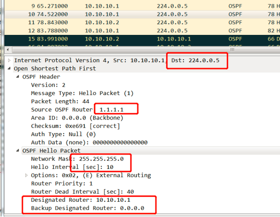 当R1开启OSPF,R2未开启OSPF时,R1以组播形式向224.0.0.5(OSPF路由器)发送hello报文。源接口未激活 OSPF的IP,目的地址为组播IP224.0.0.5,source router为1.1.1.1,Area为0,MASK为24位,hello间隔为10s,此时未建立邻居,所以邻居字段为空。