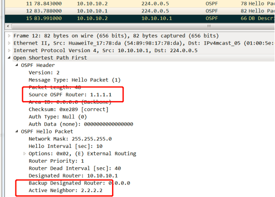 R1收到R2的hello报文。R1在自己发送的hello报文的邻居字段写入r2的router ID2.2.2.2。