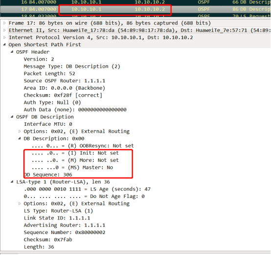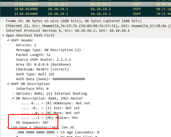 R2收到R1的报文,由于R2的router-id大,此时胜出为Master。DD报文交互由R2主导使用R2规定的序列号306。当Master/Slave选举完成后,R1进入Exchange状态,发送 DD报文给R2,由于R2为Master,R1向R2发送报文时候用R2规定的序列号306。