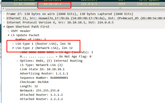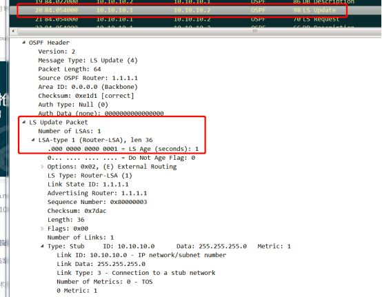R1向R2的LS Update为1类LSA。同理R2向R1的也是1类LSA