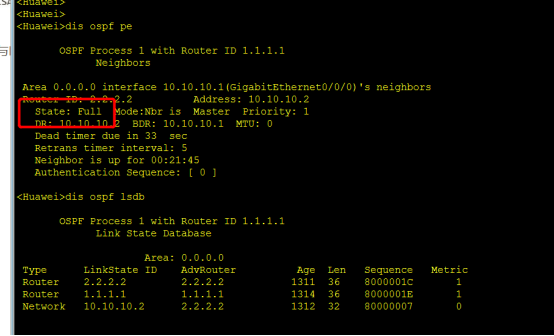 l 当路由器的邻居关系稳定后如果邻居的状态是FULL,这说明他和邻居之间形成了邻接关系