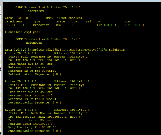 1、路由器刚启用OSPF后,用dispaly ospf peer 命令查看各路由器邻居关系和DR/BDR情况,如下图