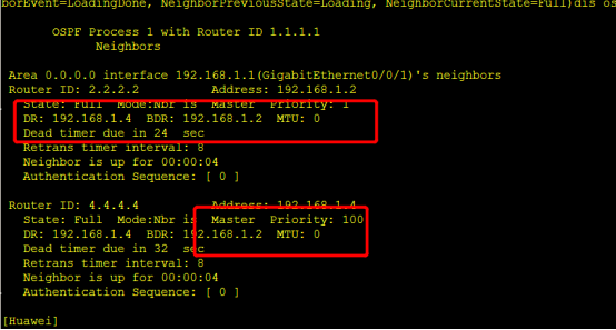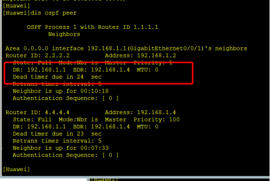 此时DR为192.168.1.4,因为在R1,R2,R4中,R4的优先级是最高的,所以R4选举成为DR。剩下R1和R2,优先级是一样的,此时比较router id,R2的Routerid2.2.2.2比R1的Router id 1.1.1.1大,所以R2选举成为BDR。这两次变化可以发现其实当DR挂了后最开始选举的BDR替代了BDR,最后再重新选举了一次DR/BDR