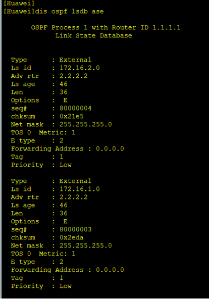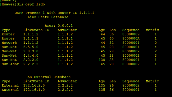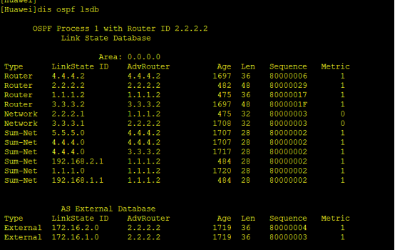 LSA5由ASBR产生。这里R3就是ASBR,R3将172.16.2.0/24和172.16.1.0/24网段重发布进入了OSPF,可以这样理解,本区域的路由器想要去外部路由或者想要知道外部路由信息得先知道去哪里找,这里通告者为2.2.2.2,那就知道了把信息交给2.2.2.2,他知道怎么去往外部路由。但是从本路由器到2.2.2.2还是一个问题,这里就引入了LSA4,下面看LSA4
